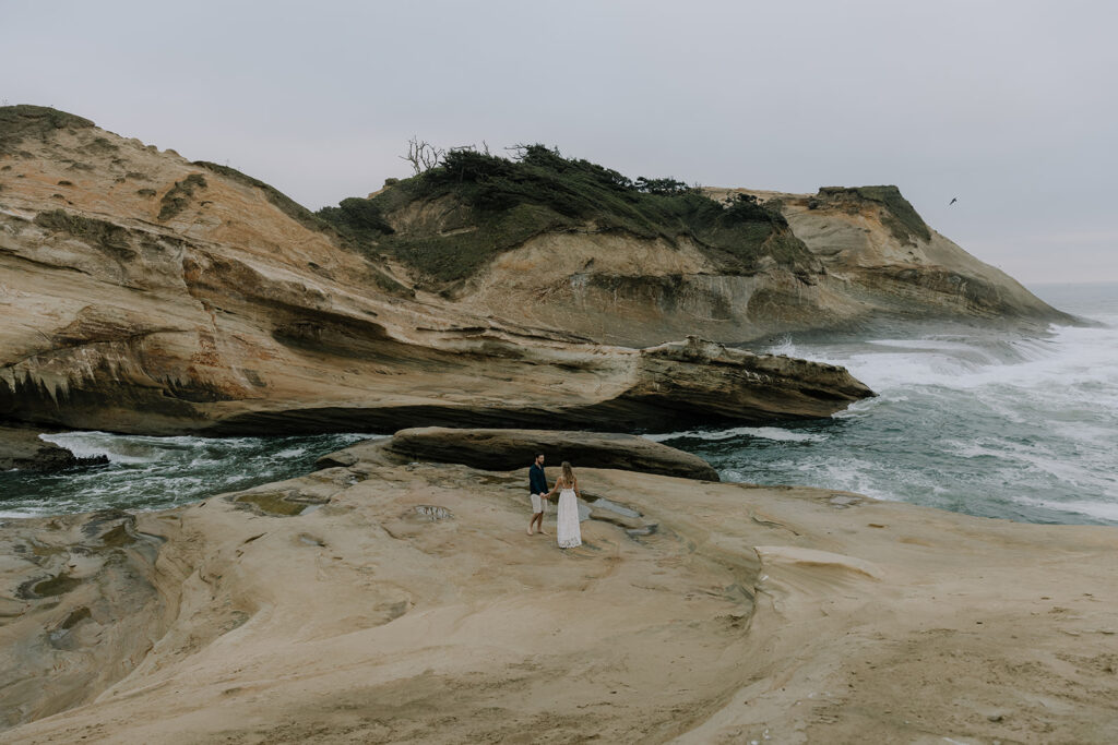 A short drive from Cannon Beach, you’ll find Hug Point, an elopement location in Oregon where you can spend all day plus more adventuring. Hug Point has hidden sea caves, a waterfall, tidal pools, and sea-carved cliffs.
